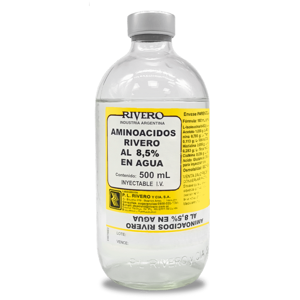 Presentación: Solución de aminoácidos al 8.5% en envase para perfusión (ej. 500 ml).